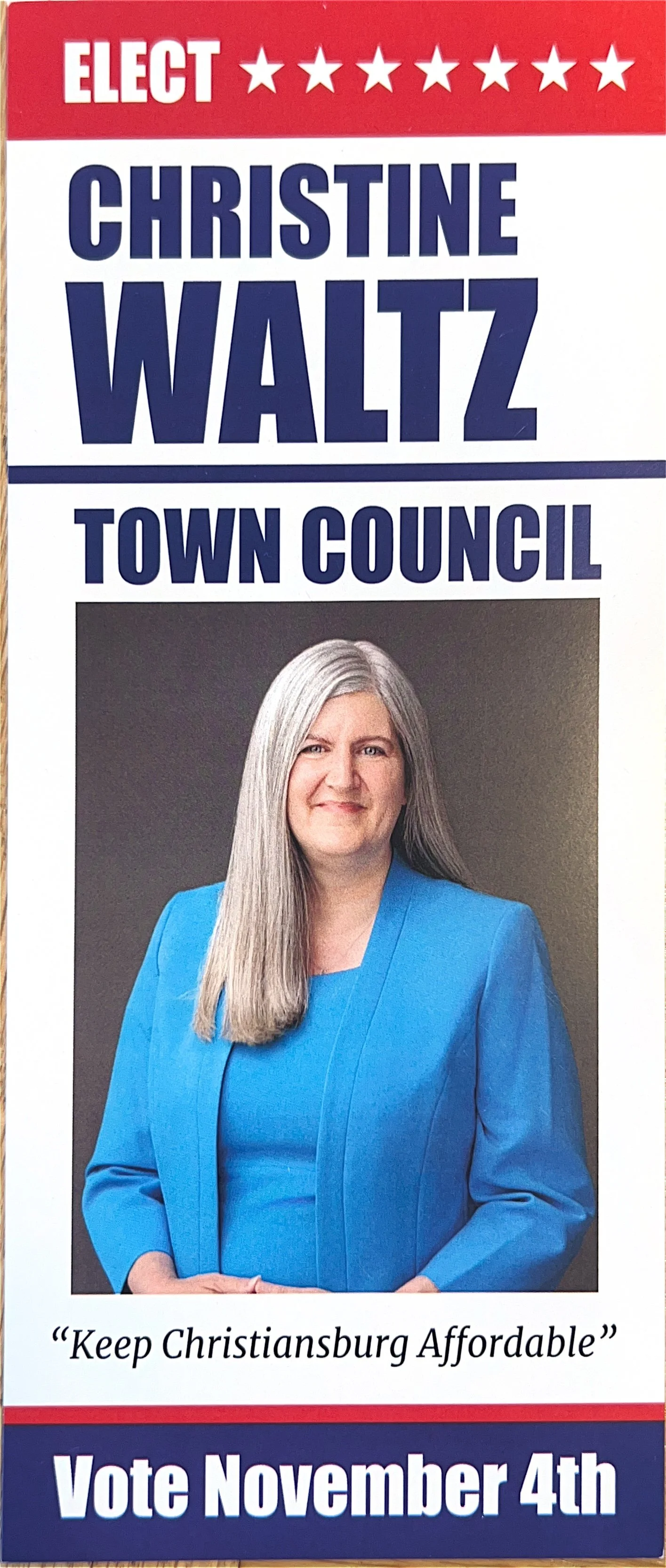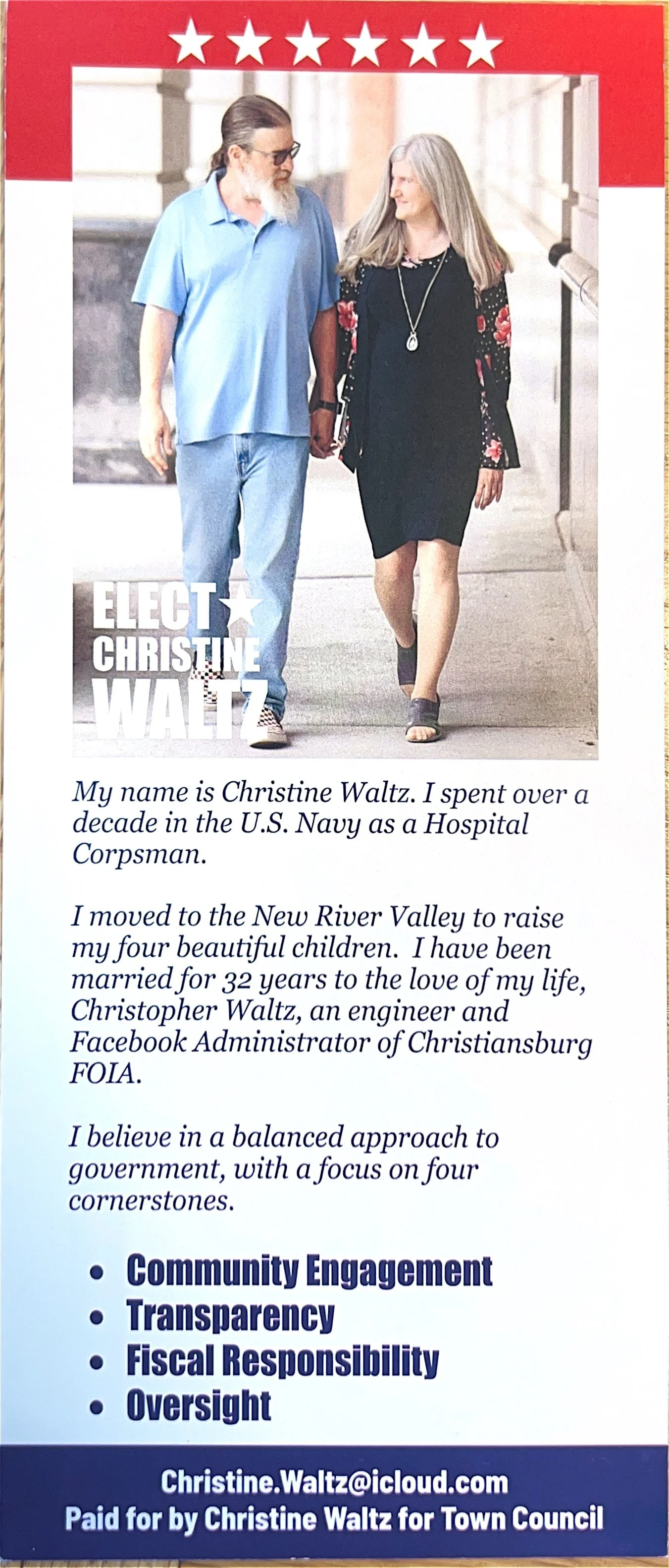 “My name is Christine Waltz. I spent over a decade in the U.S. Navy as a Hospital Corpsman. I moved to the New River Valley to raise my four beautiful children. I have been married for 32 years to the love of my life, Christopher Waltz, an engineer and Facebook Administrator of Christiansburg FOIA. I believe in a balanced approach to government, with a focus on four cornerstones.